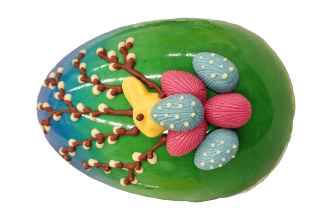 – Meiltä löytyy myös puolentoista kilon jättipääsiäismuna, jonka asiakas saa teettää meiltä valitsemistaan konvehdeista. Munan sisälle voidaan leipoa yllätyslahja asiakkaan toiveiden mukaan.