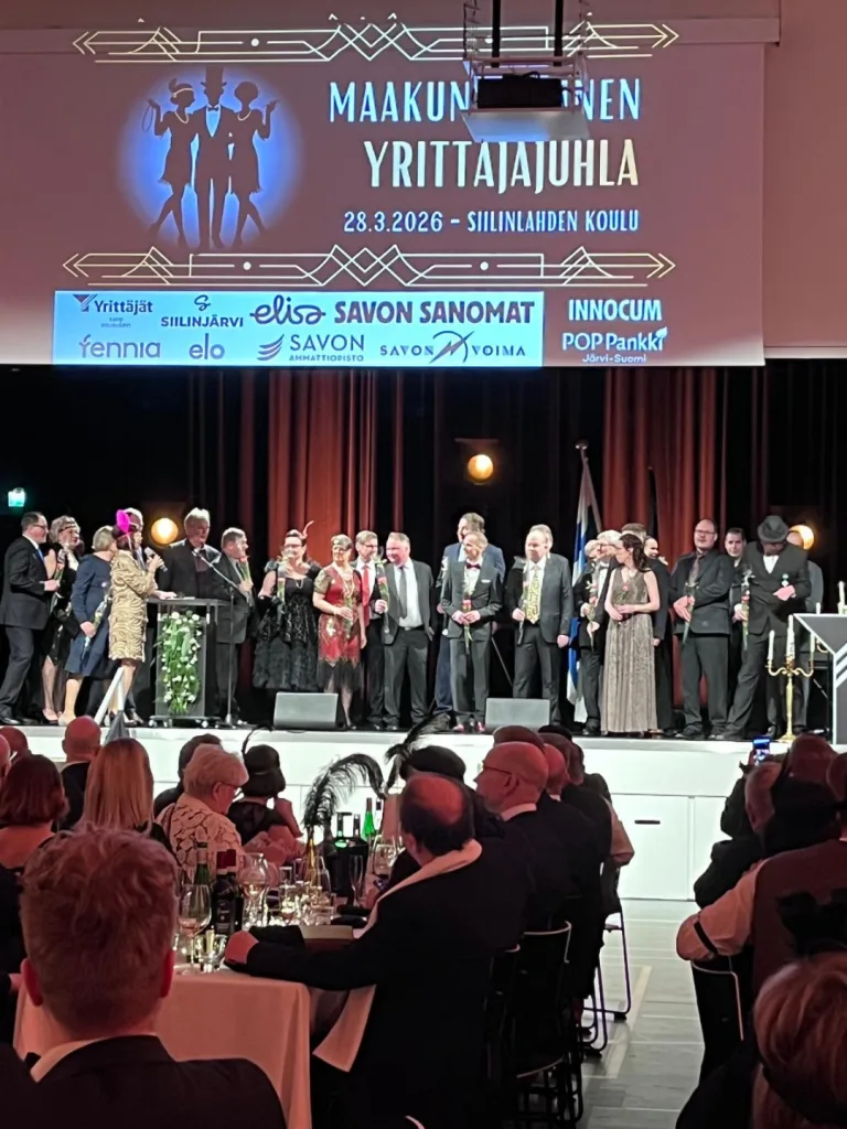 Viime lauantaina Siilinlahden koulu muuttui aikamatkaksi menneeseen, kun loppuunmyyty Pohjois-Savon maakunnallinen yrittäjäjuhla toi yhteen satoja yrittäjiä, kuntapäättäjiä ja yhteistyökumppaneita. 1920-luvun teema höyhenineen ja hapsuineen loi upeat puitteet illalle, jossa juhlittiin alueemme yrittäjyyden voimaa ja vahvaa yhteistyötä.