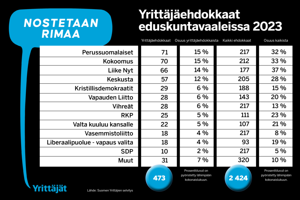 Suurin yrittäjäpuolue oli ehdokasmäärällä mitattuna Perussuomalaiset (71 ehdokasta), toiseksi suurin Kokoomus (70 ehdokasta) ja kolmanneksi Liike Nyt (66 ehdokasta). Suhteessa eniten yrittäjäehdokkaita oli Liike Nytin listoilla (37 % kaikista puolueen ehdokkaista). Yrittäjäehdokkaiden määrä kasvoi viime eduskuntavaaleista selvästi.