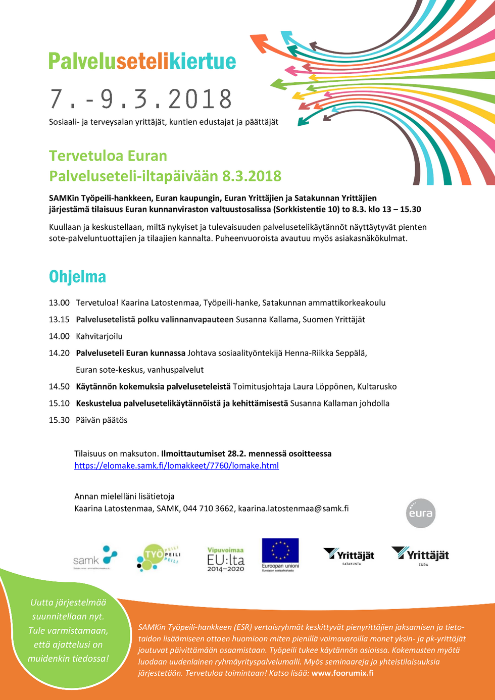 Tervetuloa Palvelusetelikiertueen Euran osuuteen to 8.3. kello 13.-15.30. Ilmoittaudu mukaan viimeistään 28.2. Katso ohjeet ja ohjelma ilmoituksesta.