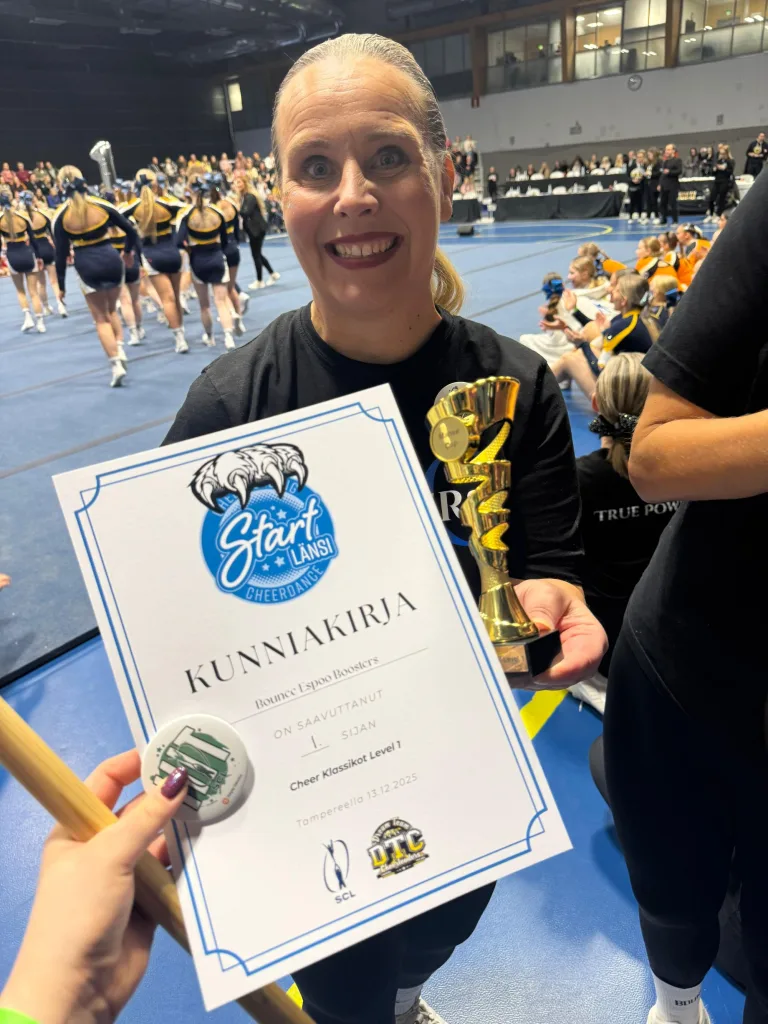 Urheilu ja ulkoilu ovat minulle hyvää stressinhallintaa. Tänä vuonna aloitin rohkeasti uuden harrastuksen: cheerleadingin. Liityin Bounce Espoon Boosters -joukkueeseen, tyttäreni ovat harrastaneet jo pitkään tuossa seurassa. Aloitin täysin ilman taustaa ja se on ollut yksi vuoden hauskimmista päätöksistä – mahtava porukka, uuden oppimista, itsensä haastamista ja jopa kisailua. Toimin myös Bounce Espoon hallituksessa ja olen mukana seuran tapahtumissa; yhteisöllisyys on iso osa perheemme arkea.