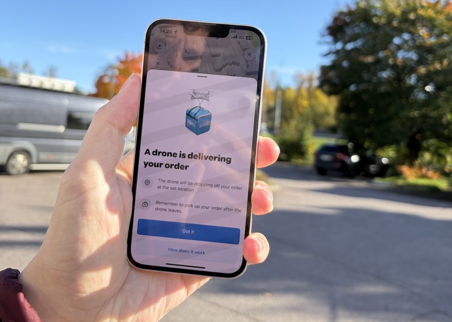 – Kun drooni ei laskeudu maahan, ei myöskään ole turvallisuusriskejä. Totta kai drooni myös skannaa, ettei tilauksen alla ole ketään.