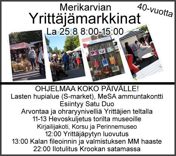 Elokuussa vietetään 40. Yrittäjämarkkinat, kaikki kynnelle kykenevät ovat tervetulleita mukaan talkoisiin vaikka vain hetkeksi. Markkinoiden lisäksi paljon muutakin tapahtumaa elokuun loppupuolella ja syyskuun alussa. Tervetuloa kaikkiin tapahtumiin!