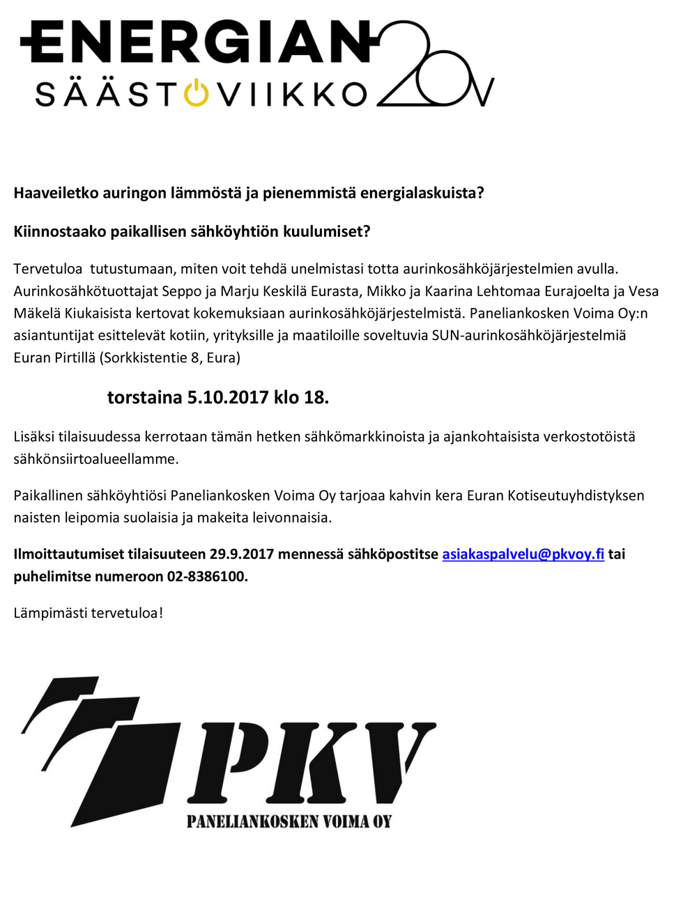 Osallistu torstaina 5.10.2017 kello 18 Euran Pirtillä järjestettävään ajankohtaiseen energiansäästöiltaan. Maksutonta ja kaikille avointa tilaisuutta isännöi paikallinen sähköyhtiö Paneliankosken Voima Oy. Ilmoittautumisohjeet löydät tiedotteesta.