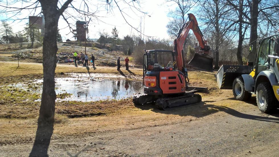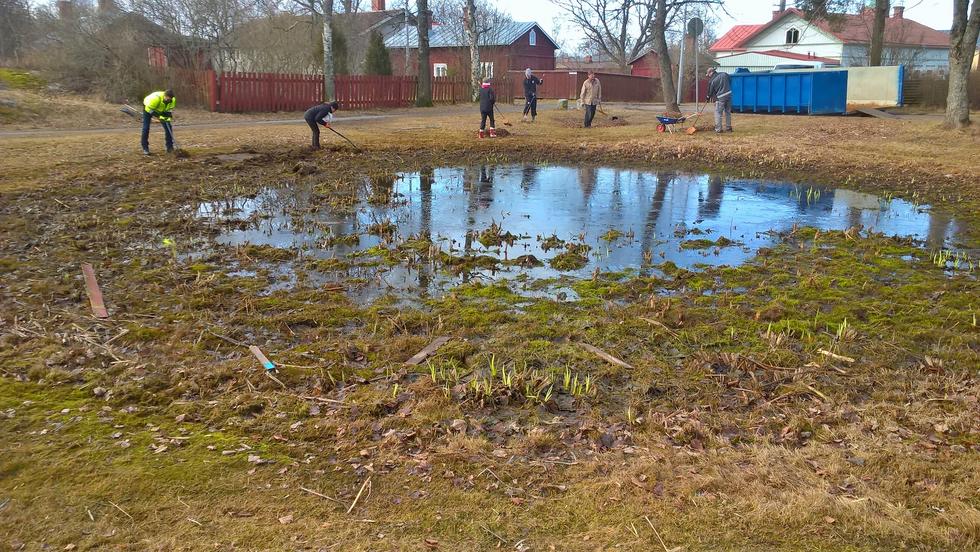 Lauantaina 8.4.2017 oli Uudenkaupungin Yrittäjien talkoopäivä. Toistakymmentä yrittäjää ja pari nuorempaakin talkoolaista puhdistivat lähes umpeenkasvaneen altaan ja sen reunat roskista, sammaleesta, erilaisista kasveista ym. Myös allasta ympäröivä nurmikko haravoitiin lehdistä ja risuista.
