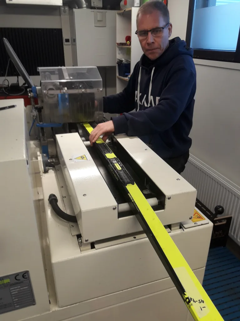 – Ensin suksen pohja oikaistaan ja kaikki naarmut poistetaan. Sen jälkeen pohja ajetaan sileäksi ja kuvioidaan. Pystyn ohjelmoimaan tietokoneella suksen pohjaan haluamani kuvion sadasosamillin tarkkuudella, Kohonen kertoo.