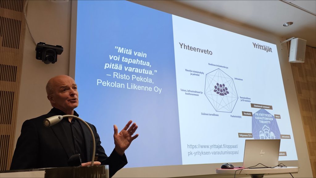Tilaisuuden päätti Antti Neimalan puheenvuoro pk-yritysten varautumisesta häiriötilanteisiin. Neimala laati yhdessä Yrittäjien varautumisryhmän kanssa varautumisoppaan pk-yrittäjille aiemmin syksyllä. Oppaassa käsitellään tilanteita, jotka voivat yllättää yrityksen arjessa. Tällaisia tilanteita voivat olla esimerkiksi suurimman asiakkaan maksuvaikeudet, sähkön tai vedenjakelun keskeytyminen, tietomurrot, internet-yhteyden katkokset sekä toimitusvaikeudet.