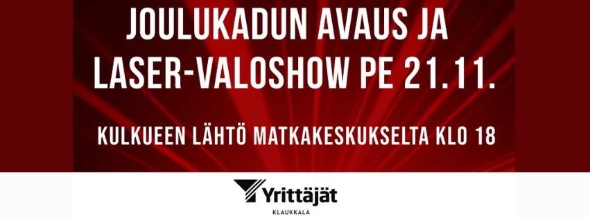 Klaukkalan Yrittäjät ry järjestää perinteiset Klaukkalan Joulukadun avajaiset. Tapahtumaa vietetään 24.11. klo 18.00 alkaen. Joulukadun avajaisia on vietetty vuodesta 1994. Joulukulkue lähtee matkakeskukselta joulupukin johdattamana 18.00. Tätä ennen kokoonnutaan ja jaetaan hehkuvia värikkäitä valotikkuja. Kulkue kulkee matkakeskukselta torille, joten matka on lyhyt ja perheen pienimmätkin jaksavat olla mukana. Pahoittelemme mahdollisia viivästyksiä liikenteessä reitin varrella. Poikkevista liikennejärjestelyistä Klaukkalan yrittäjiä avustaa Metsäkylän VPK.