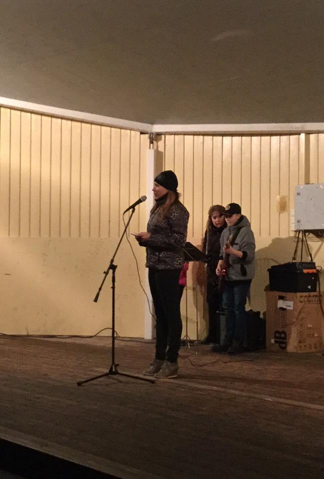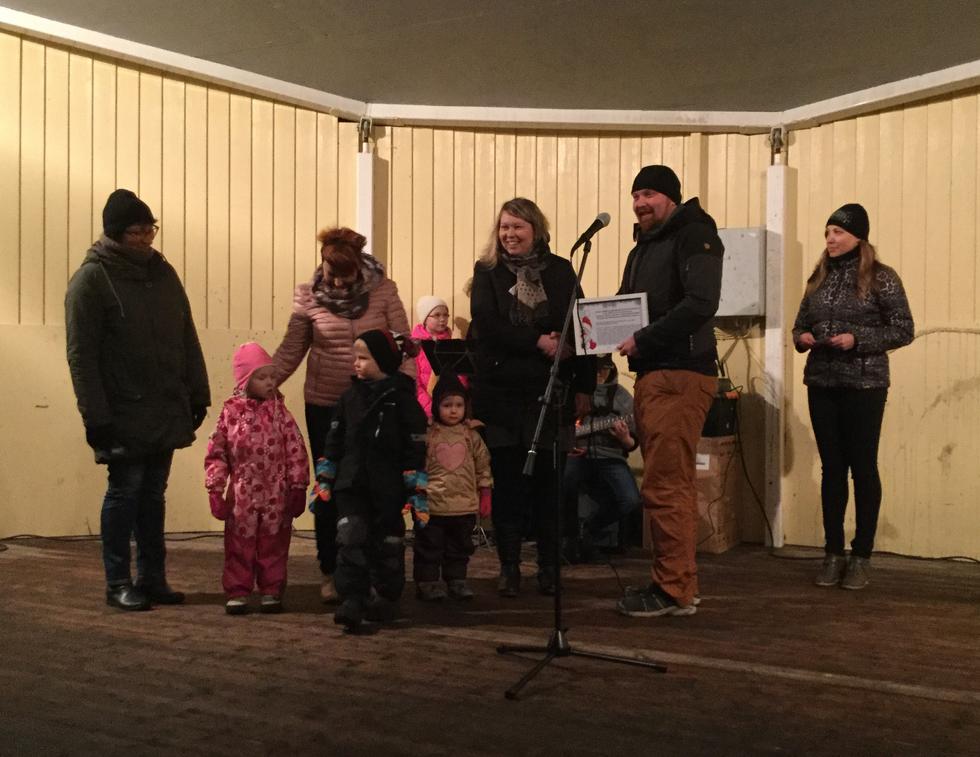 Taustalla trimmaa soittimiaan Ekolan perheyhtye, joka esitti tilaisuudessa joululauluja.