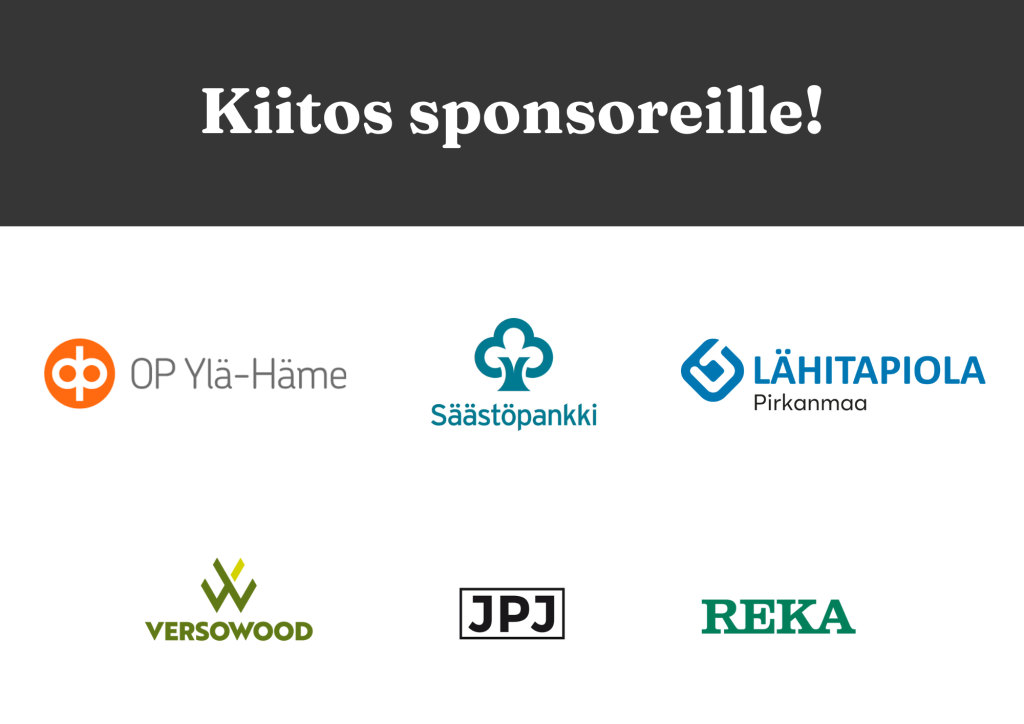 - Sponsoriyrityksille, jotka mahdollistivat juhlan toteutumisen ja tarjosivat näkyvyyttä paikalliselle yrittäjyydelle. Kiitos siis kuuluu: Osuuspankki Ylä-Häme, Säästöpankki Sinetti, LähiTapiola Pirkanmaa, Versowood, JPJ-Wood sekä Reka!