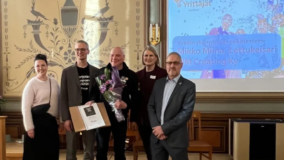 Kuopiolainen yrittäjä Mikko Miina on valittu Kuopion Yrittäjien Vuoden Yksinyrittäjäksi 2026. Puheenjohtaja Aki Karkulahti ja toiminnanjohtaja Anna-Maija Lintuniemi luovuttivat palkinnon Miinalle pitkäjänteisestä työstään savolaisen ruokaperinteen vaalijana Kaupunginjohtajan ja yrittäjien yhteisessä aamiaistilaisuudessa keskiviikkona. Miina on rakentanut persoonallaan tunnistettavan Kuopijon Lettukeisari -brändin, joka vie muurinpohjalettuja tapahtumiin ympäri Suomen ja Eurooppaa.