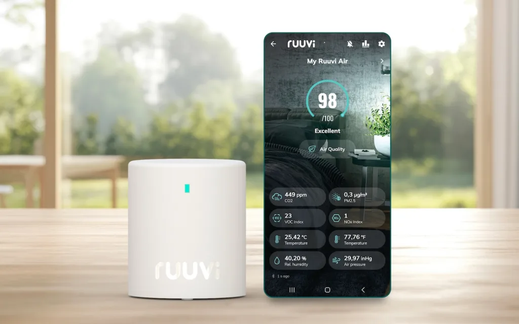Yrityksen uusin innovaatio Ruuvi Air mittaa sisäilman pienhiukkasia, hiilidioksidia, haihtuvia orgaanisia yhdisteitä, typen oksideja, lämpötilaa, ilmankosteutta ja ilmanpainetta.