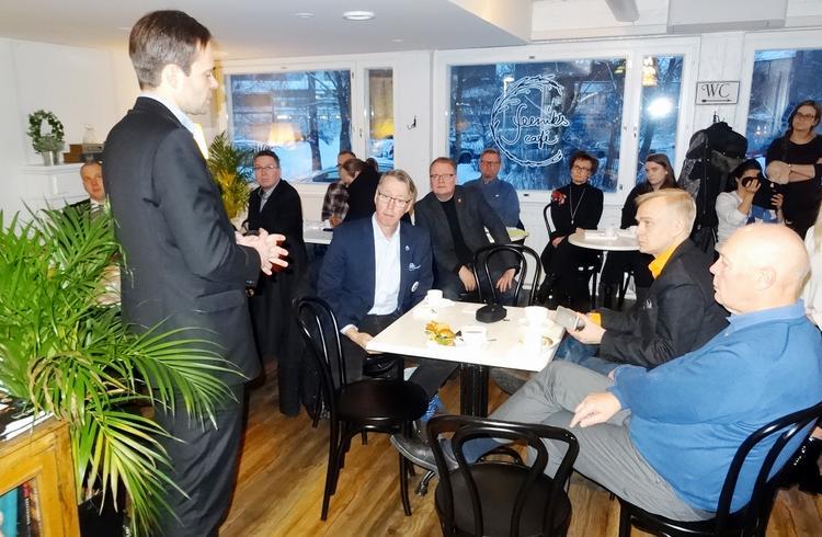 Tai oikeammin ulkomaankauppa- ja kehitysministeri joi kahvinsa seisaallaan, sillä samalla hän alusti ajankohtaisista asioista ministerin pestissään ja vastasi riihimäkeläisten yrittäjien kysymyksiin.