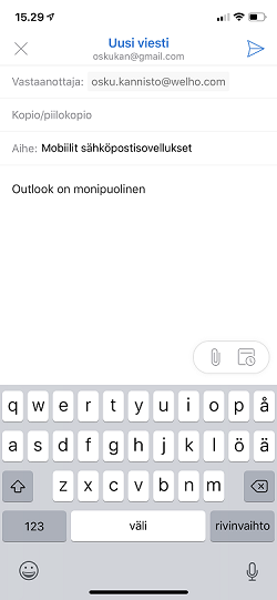 Ilmaisohjelma on saatavilla Androidille ja iOS:lle. Outlook on täysin suomennettu.