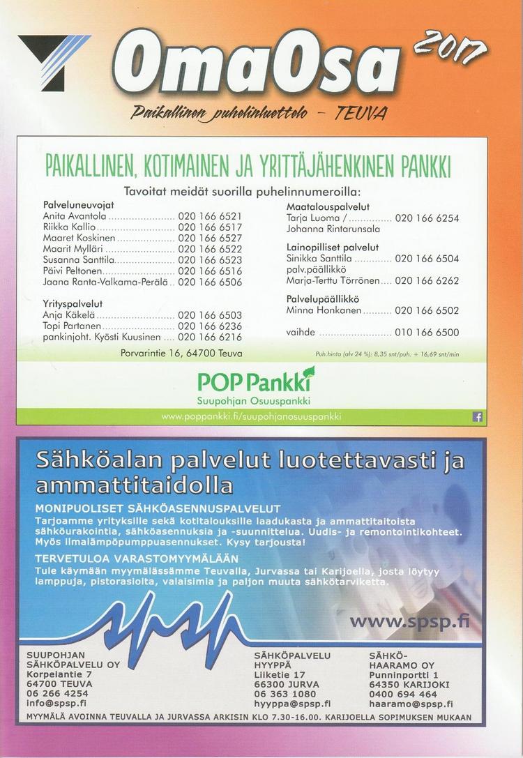 Kesän aikana jaettiin teuvalaistalouksiin uusittu OmaOsa -puhelinluettelo. Toimistolle jäi jonkunverran luetteloita, joten jos postipoika ei laatikkoosi luetteloa kantanut, voit noutaa luettelon yrittäjien toimistolta, POPpankista tai Tekstiili-Kiurusta.