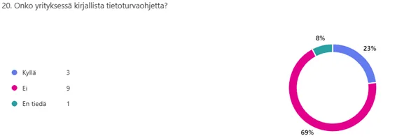 Tekniset ratkaisut ovat monella tasolla kunnossa, mutta kirjalliset ohjeet ja toimintamallit puuttuvat usein. Vain kolmella yrityksellä on kirjallinen tietoturvaohje, ja kuudella ei ole toimintamallia tilanteeseen, jossa laite katoaa tai varastetaan. Moni ei ole täysin varma, miten toimia tietoturvahäiriön sattuessa.