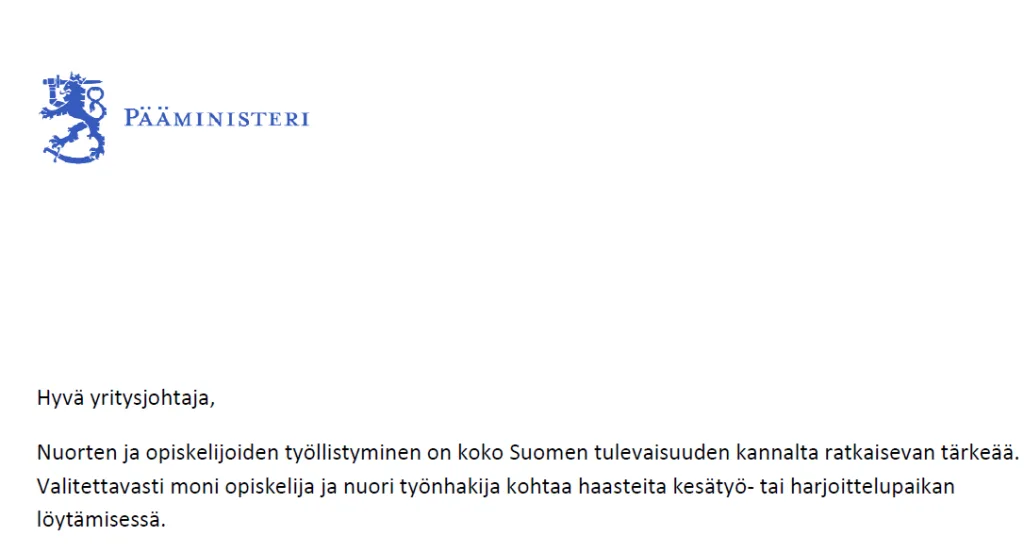 Pääministeri korostaa kirjeessään, että nuorten ja opiskelijoiden työllistyminen on koko Suomen tulevaisuuden kannalta ratkaisevan tärkeää.