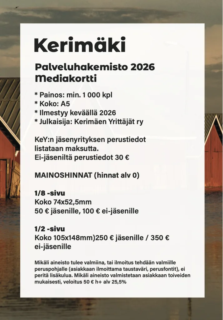 Kerimäen Yrittäjät päivittää paikallisen palveluhakemiston. Uudistuksen tavoitteena on tarjota ajantasainen ja kattava koonti alueen yrityksistä ja palveluista. Hakemiston tietojen kokoamista hoitaa 4H-yrittäjä Eelis Kemppainen. Tiedot ja mahdolliset varaukset voi ilmoittaa myös itse verkkolomakkeen kautta.