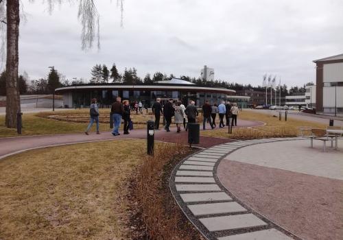 Kuvassa kevätretkeläiset saapumassa Fazer Vierailukeskukseen