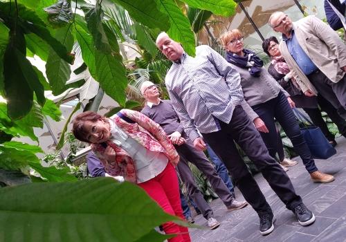 Kuvassa kevätretkeläisiä Fazer Vierailukeskuksen trooppisessa puutarhassa