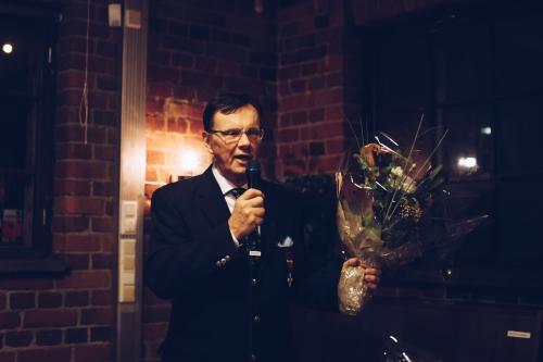 Palkitsemiset aloitettiin hieman tavallisuudesta poikkeavalla tavalla. Nimittäin Ilse Lahdenpohjalla oli ilo ja kunnia kertoa, että yhdistyksen hallitus oli 24.10.2018 pidetyssä sääntömääräisessä syyskokouksessa esittänyt, että Kalevi Nordmanista tehtäisiin vuoden 2019 alkaessa Pispala-Pyynikin Yrittäjät ry:n kunniapuheenjohtaja. Hallituksen esitys hyväksyttiin, joten nyt Y-juhlassa oli sopiva tilaisuus palkita Kalevi Nordman. Hienon Pispala-aiheisen taulun saanut Kalevi on yhdistyksen perustajajäsen, minkä lisäksi hän on aiemmin toiminut hallituksen puheenjohtajana. 35-vuotinen taival hallituksessa päättyy vuoden 2018 lopussa.