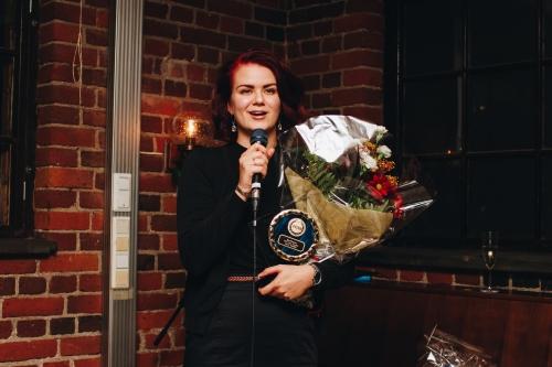 Seuraavaksi illan juhlaohjelmassa oli vuorossa yhdistyksen vuoden 2018 nuoren yrittäjän palkitseminen. Tällä kertaa tehtiin historiaa, sillä nyt nuorta yrittäjää viidettä kertaa palkittaessa palkinnon saanut oli ensimmäistä kertaa nainen. Palkitsemispuheen piti hallituksen jäsen, jäsenvastaava Johannes Lepistö, joka aloittaa Pispala-Pyynikin Yrittäjien uutena puheenjohtajana tammikuussa 2019.