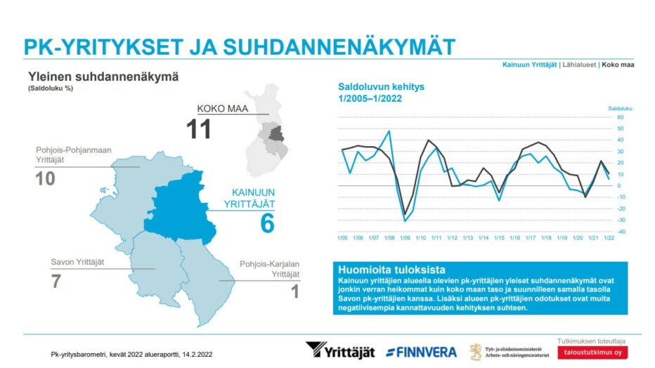 Kainuulaisten pk-yritysten yleiset suhdannenäkymät ovat hieman koko maata heikommat, mutta samalla tasolla Savon yrittäjien kanssa (Kainuu +6, Savo +7, koko maa +11). Yritysten odotukset liikevaihdon (Kainuu +12, koko maa +25) ja varsinkin kannattavuuden (Kainuu -12, koko maa +1) kehityksen suhteen ovat muuta maata heikommat, toisaalta sama kehitys nähdään Savossa ja Pohjois-Karjalassa.