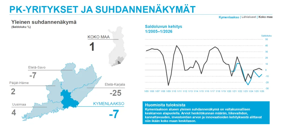 Kymenlaakson pk-yritysten suhdannenäkymät ovat kevään 2026 Pk‑yritysbarometrissa yhä selvästi miinuksen puolella, mutta pitkään jatkuneen heikkenemisen jälkeen yritysten odotuksissa näkyy ensimmäistä kertaa varovaisia merkkejä parempaan suuntaan. Yleinen suhdannenäkymä on noussut ja on nyt saldoluvulla –7.