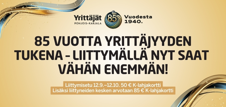 Liittymällä Pohjois-Karjalan Yrittäjiin kampanja-aikana 12.9.–12.10.2025 saat K-ryhmän lahjakortin (arvo 50 €). Lisäksi kaikkien liittyneiden kesken arvotaan 85 € K-lahjakortti.