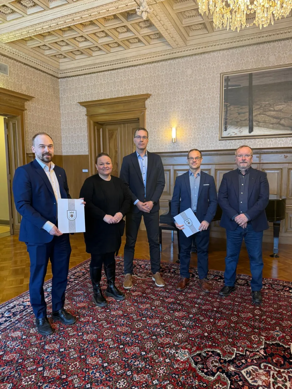 Artikkelikuvassa allekirjoitettujen lupausten kanssa kuvassa ovat kaupunginhallituksen puheenjohtaja Mikael Ropo (vasemmalla), kaupunginvaltuuston puheenjohtaja Krista Kiuru, kaupunginjohtaja Lauri Inna sekä Porin Yrittäjien hallituksen edustajina varapuheenjohtaja Rami Viitasaari ja puheenjohtaja Mika Tuovinen.