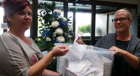 Arvonta suoritettiin tiistaina 26.9. klo 12.00. Onnettarina toimivat Porin Yrittäjien sihteeri Nina Huhtamäki ja Satakunnan Museon asiakaspalveluassistentti Tarja Grönman (kuva).