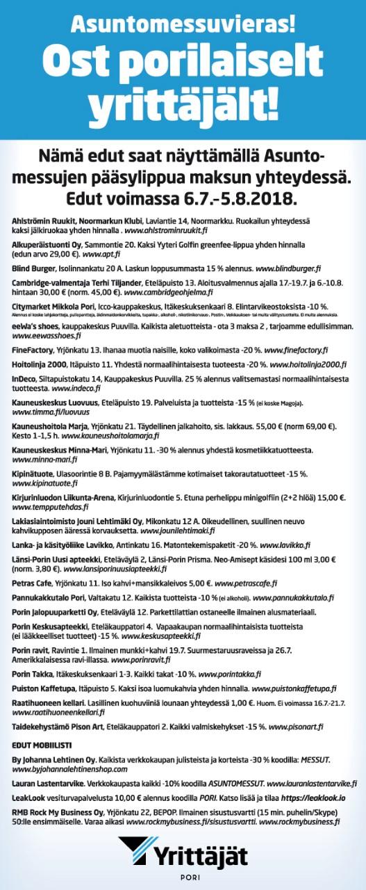 Porin Yrittäjien jäsenyritysten tarjoamia etuja Asuntomessut -vieraille Porissa 6.7.-5.8.2018 ! Ost porilaiselt yrittäjält !