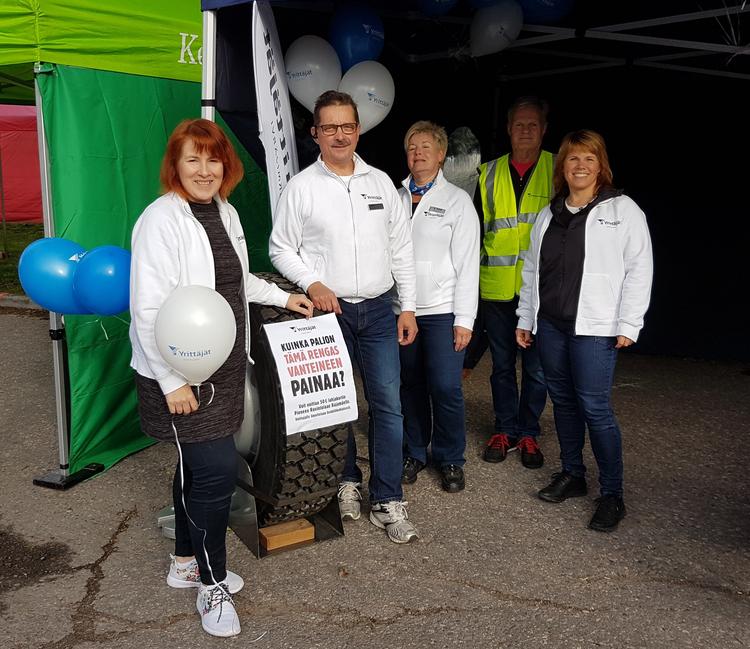 Nurmijärven Yrittäjien teltalla riitti vilinää, kun suuri rengas vanteineen kiinnitti kulkijoiden huomion. Renkaan painoa ihmeteltiin ja kilautettiin jopa kavereillekin.