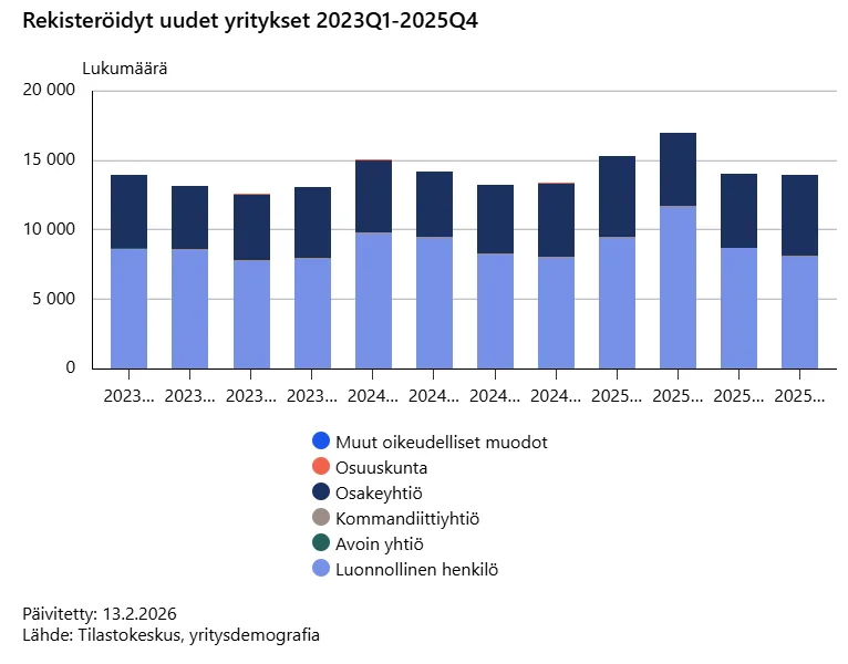 Vuoden 2025 neljännen vuosineljänneksen aikana rekisteröitiin 13 977 uutta yritystä, kertoo Tilastokeskus. Edellisen vuoden vastaavaan ajankohtaan verrattuna rekisteröintien määrä lisääntyi viisi prosenttia.
