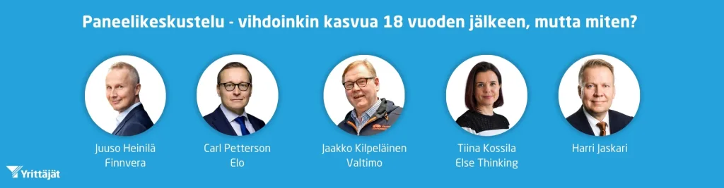 Paneelikeskusteluun osallistuivat Finnveran toimitusjohtaja Juuso Heinelä, työeläkeyhtiö Elon toimitusjohtaja Carl Pettersson, Jaakko Kilpeläinen (CEO, Valtimo Components Oyj) sekä Else Thinkingin perustaja ja toimitusjohtaja Tiina Kossila. Keskustelun veti Harri Jaskari.