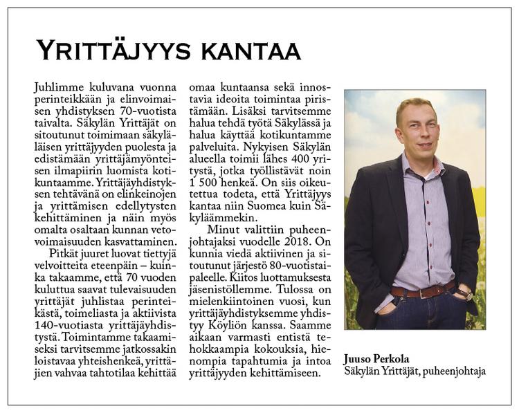 Säkylän Yrittäjien puheenjohtaja Juuso Perkola: Yrittäjyys kantaa