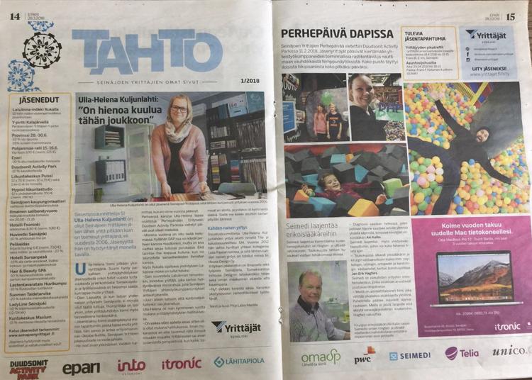 Seinäjoen Yrittäjien ja kaupunkilehti Eparin yhteistyön ensimmäinen TAHTO-liite ilmestyi 28.3.2018. Liitteessä esitellään Seinäjoen Yrittäjien jäsenetuja InHouse Designin yrittäjän Ulla-Helena Kuljunlahden henkilökohtaisten esimerkkien avulla sekä konkreettisena listauksena. Tutustu TAHTO-liitteeseen sekä koko Epariin!