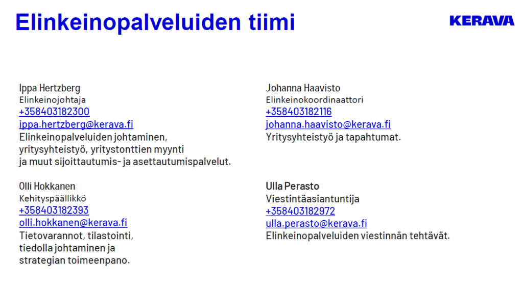 Oli hienoa myös kuulla, että Keravan Kaupunki haluaa tehdä yhteistyötä keravalaisten yritysten kanssa. Keravan kaupunkistrategisena tavoitteena on olla Uudenmaan yrittäjäystävällisin kunta.
