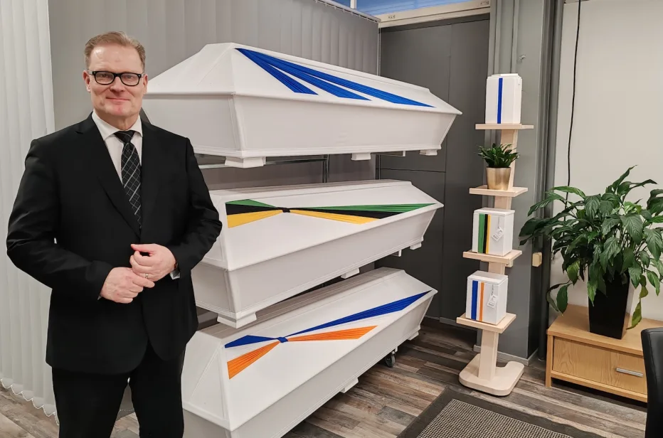 Marko Mielosen hautauspalvelussa on tarjolla Tapparan tai Ilveksen tunnusvärein verhoiltuja arkkuja.