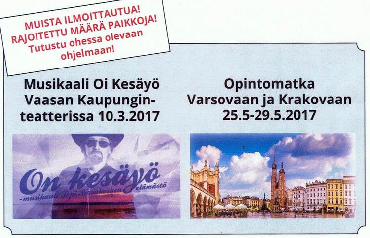 Olemme Teuvan Yrittäjissä miettineet tapahtumia jäsenistölle ja tässä olisi nyt tarjolla ensin viihteellinen tapahtuma ja keväämmällä opintomatka. Toivon, että mahdollisimman moni teistä innostuu ja lähtee mukaan. Lisätietoja tulevista matkoista tässä liitteenä.