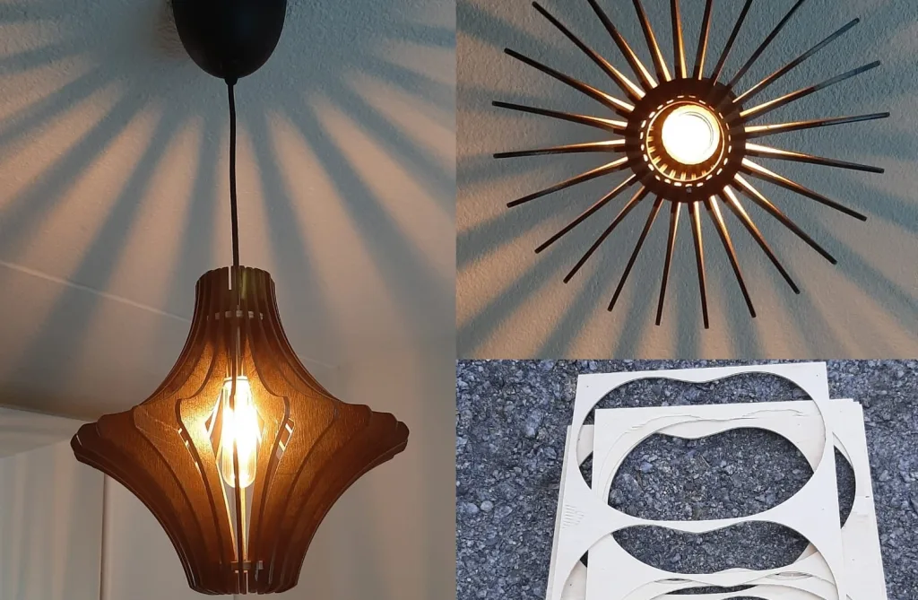 – Eihän sellaista materiaalia voinut pois heittää. Sain idean, että niistä saisi tehtyä valaisimen. Muoto valaisimeen tuli suoraan reunojen muodoista, Kautiala kertoo.