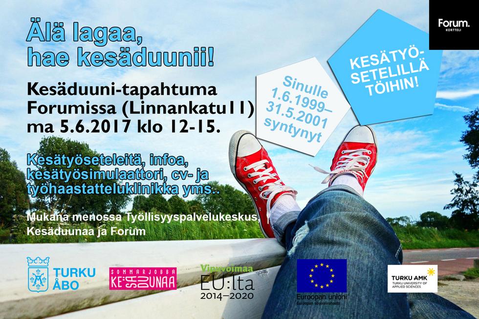 Turun kaupungin Yritys- ja työllisyystiimi järjestää Forumin kauppakeskuksessa 5.6.2017 klo 12-15 ”Älä lagaa, hae kesäduunii!” –tapahtuman. Tapahtumassa on infoa ja markkinoidaan Kesätyöseteliä. Paikalla on Turun kaupungin lisäksi myös Turun Ammattikorkeakoulu sekä Kesäduunaa.