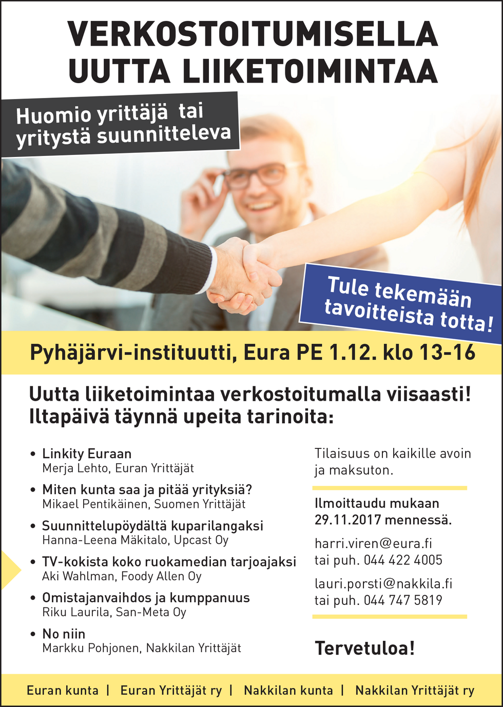 Tule tapaamaan ja kuulemaan toisia yrittäjiä Euran Pyhäjärvi-instituuttiin 1.12. kello 13-16. Paikalla on myös Suomen Yrittäjien toimitusjohtaja Mikael Pentikäinen.