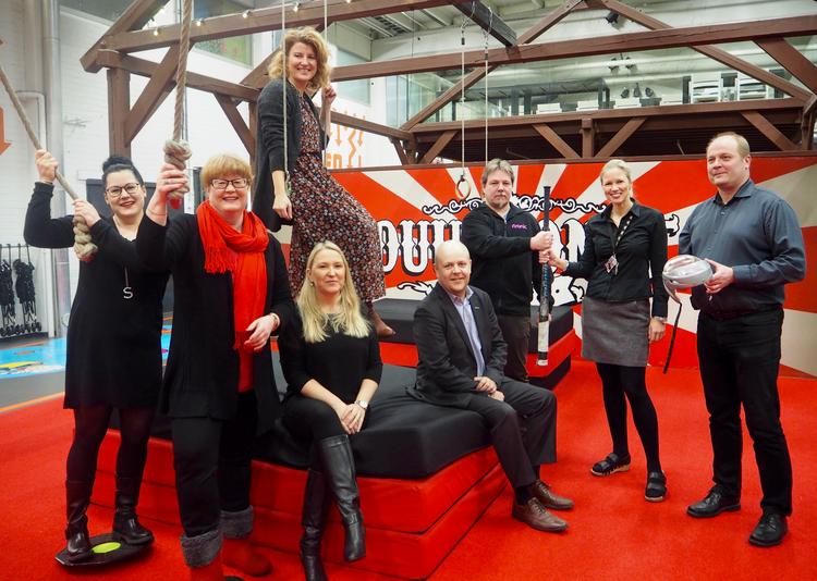 Kuvassa vasemmalta: Sari Nisula (Boutique S), Kaija Kuusela (Seinäjoen KK-tilit), keinussa Hannemari Niemi (Into Seinäjoki Oy), Nina Pahkala (Kompassi), Antti Savola (Nordea), Janne Haapasalmi (iTronic), Maarit Karvonen (Duudsonit Activity Park) sekä Tero Pukkila (Ferrum Group Oy). Kuva: Johanna Rintamäki.