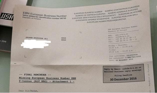 Kuvioon kuuluu, että monille yrittäjille tulee ensin sähköpostitse useita EBN:n kirjeitä ja sen jälkeen tipahtaa yleensä postiluukusta kirje, joka on ”viimeinen muistutus”.