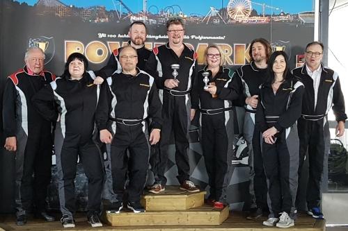 Samaan aikaan kun 5D-elokuvien ihmeellisestä maailmasta nauttineet lähtivät pikaisesti poikkeamaan kauppakeskus Road Housessa, kartingautot kulkivat pitkin PowerParkin asfaltoitua ajorataa. Ajamisen mallia muille näytti Kai Lahdenpohja, joka lähti harjoituksia ja aika-ajoja seuranneeseen kilpailuun paalupaikalta, koska hän oli aika-ajojen nopein. Niin paljon on ”Kaitsu” moottoriurheilua harrastanut, että myös itse kilpailusta heltisi voitto käsiongelmista huolimatta. Toisesta ruudusta kilpailuun startannut puheenjohtajamme Ilse Lahdenpohja näytti, että innokas moottoripyöräilijä taitaa nelipyöräistenkin niksit. Pieni ajovirhe verotti kuitenkin sen verran, että kolmosruudusta lähtenyt hallituksen sihteeri Vesa Karppinen pyyhkäisi Ilsestä ohi. Ensi kertaa PowerParkissa kaasutellut Vesa sijoittui näin lopulta toiseksi ja Ilse oli komeasti kolmas. Harjoituksissa ja aika-ajossa kuskeja oli yhdeksän, itse kisassa kahdeksan.