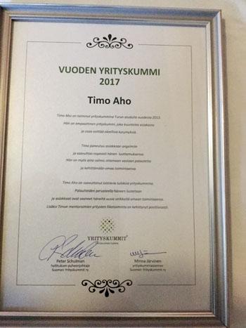 Suomen Yrityskummit ry on valinnut Vuoden Yrityskummiksi 2017 Timo Ahon Turusta. Valinnassa painotettiin Ahon panosta aktiivisena yrityskummina.