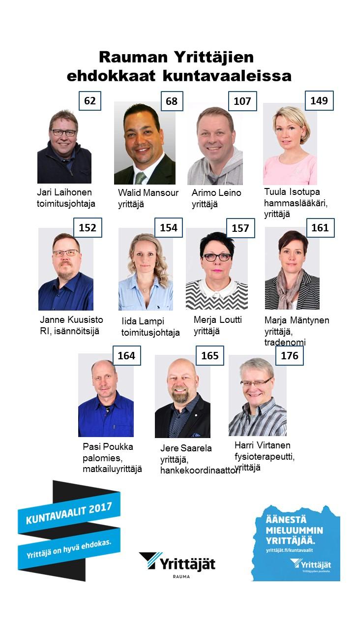 Kuntavaaleissa 2017 on ehdolla Raumalta 22 yrittäjää. Heistä 11 on yrittäjäjärjestön jäsentä. Suomen Yrittäjät toivoo yrittäjiä mukaan kunnalliseen päätöksentekoon puoluekannasta riippumatta. Kuvassa ehdolla olevat yrittäjäjäsenemme.