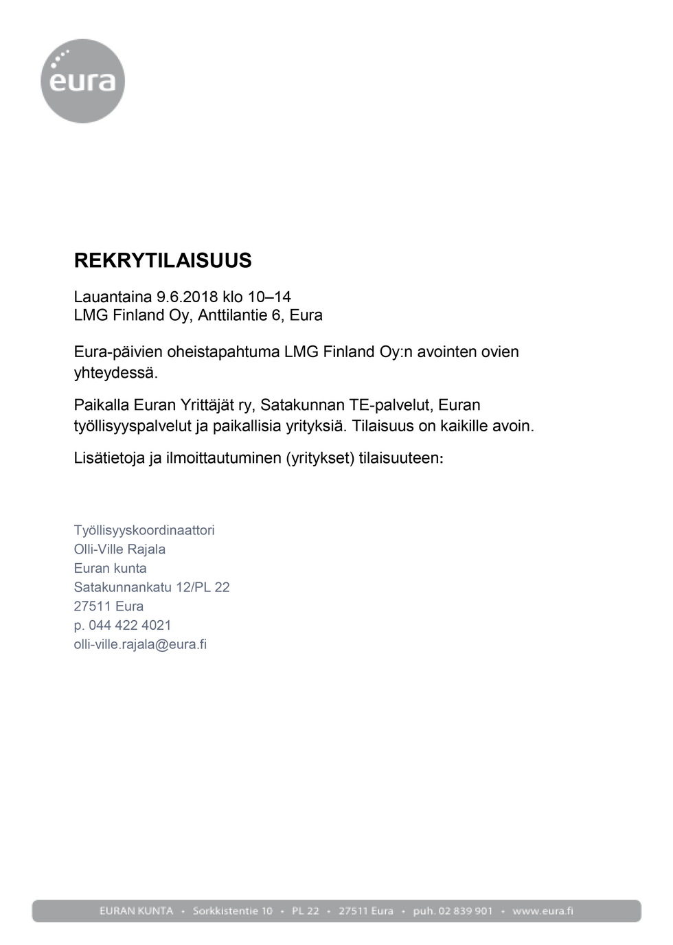 Rekrytilaisuus pidetään Eura-päivien yhteydessä 9.6. klo 10-14 LMG Finland Oy:n tiloissa. Katso ilmoitus.