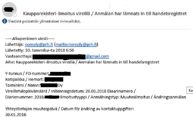 Yrittäjä oli onneksi merkinnyt yhteystietoihinsa myös sähköpostiosoitteen, johon PRH lähettää automaattisesti ilmoituksen vireillä olevasta muutoksesta.